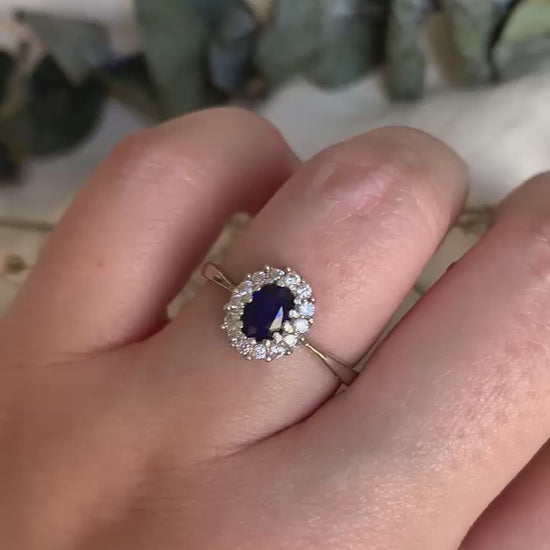 Anillo ZAFIRO difussion (natural) con circones blancos alrededor elaborado en plata rodinada. *difusión es un tratamiento para mejorar su color.