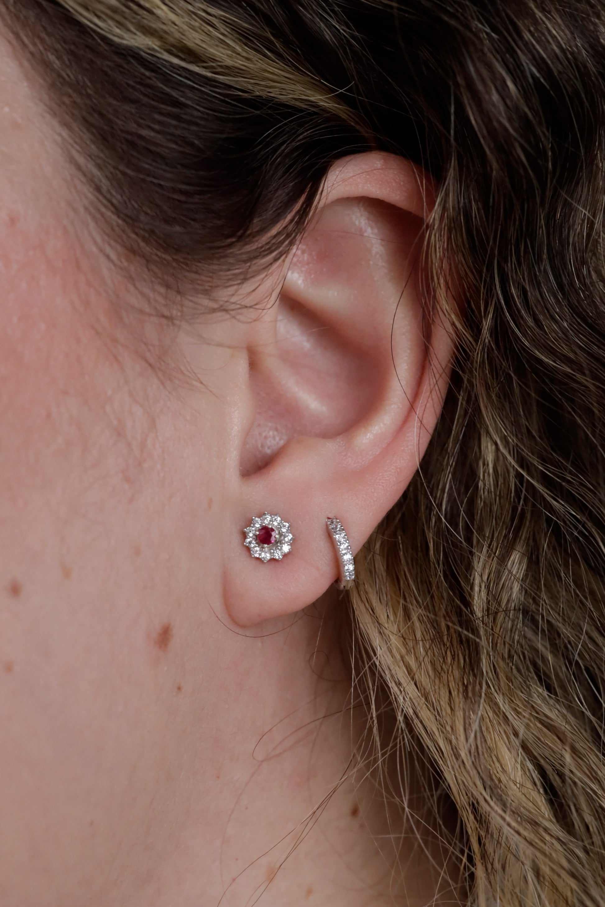 Topo halo flor lucia RUBÍ NATURAL central y circones blancos alrededor elaborados en plata con baño de oro 24K amarillo. $ 350.000